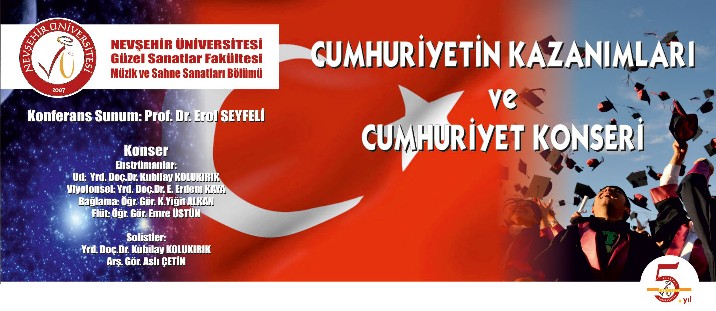 NevÅŸehir Üniversitesi (NEÜ) Güzel Sanatlar Fakültesi Müzik ve Sahne Sanatları Bölümü, “Cumhuriyetin Kazanımları ve Cumhuriyet Konseri” isimli bir etkinlik gerçekleÅŸtirecek. Hacı BektaÅŸ Veli Kültür Merkezi’nde 02 Kasım 2012 Cuma günü saat 14:00’de baÅŸlayacak etkinlikte önce Prof. Dr. Erol Seyfeli tarafından “Cumhuriyetin Kazanımları” baÅŸlıklı bir konferans verilecek. “Cumhuriyet Konseri”ne ise ÅŸu sanatçılar katılacak: Yrd. Doç. Dr. Kubilay Kolukırık (solist ve ud), ArÅŸ. Gör. Aslı Çetin (solist), Yrd. Doç. Dr. E. Erdem Kaya (viyolonsel), Öğr. Gör. K. YiÄŸit Alkan (baÄŸlama), Öğr. Gör. Emre Üstün (flüt).